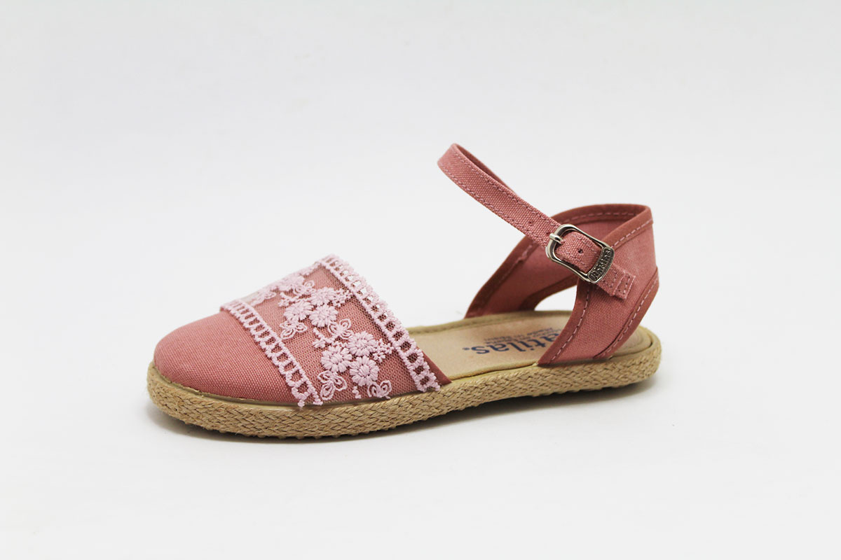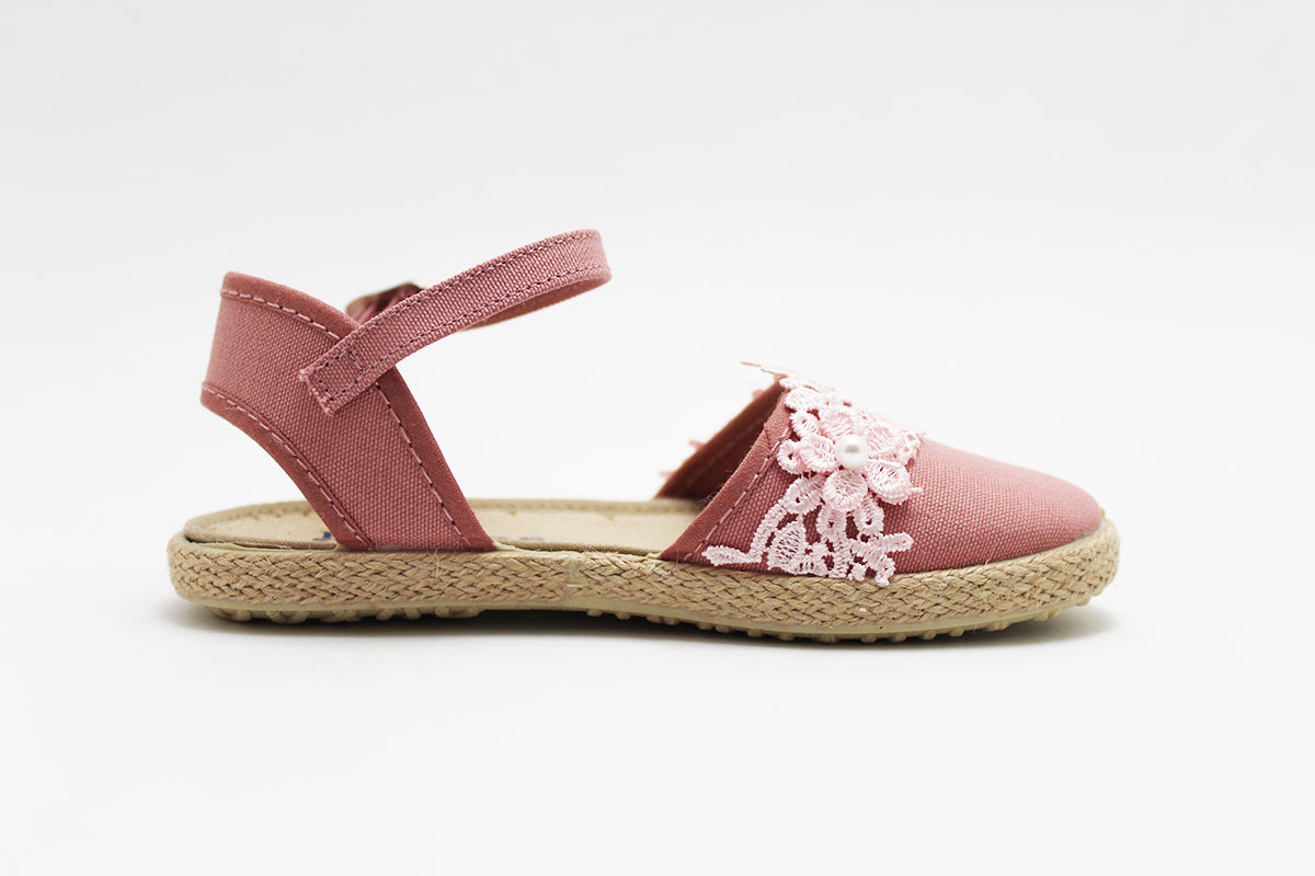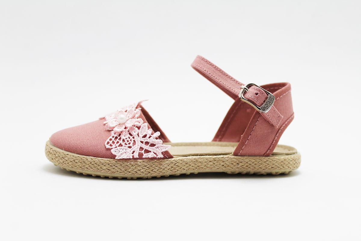 Alpargata clásica de esparto en color rosa, con diseño de bordado, para niña. Es una esparteña tipo sandalia en lona 100% algodón. Disponible en color rosa, el tono clásico por excelencia muy presente en ceremonias como bodas, comuniones o bautizos.