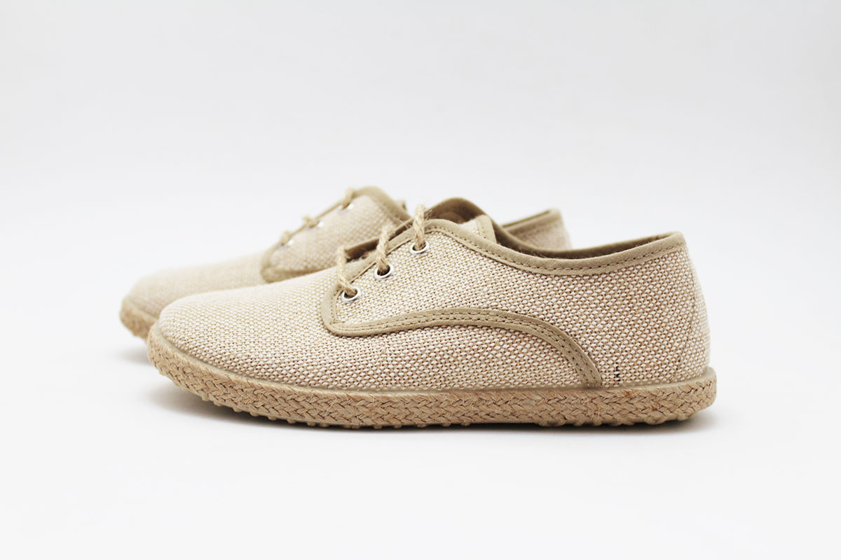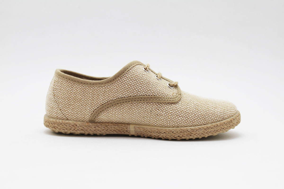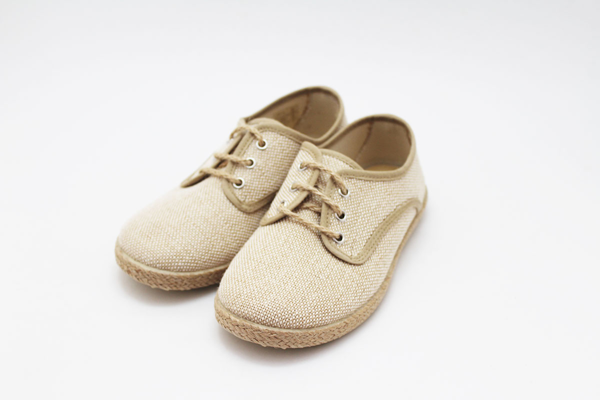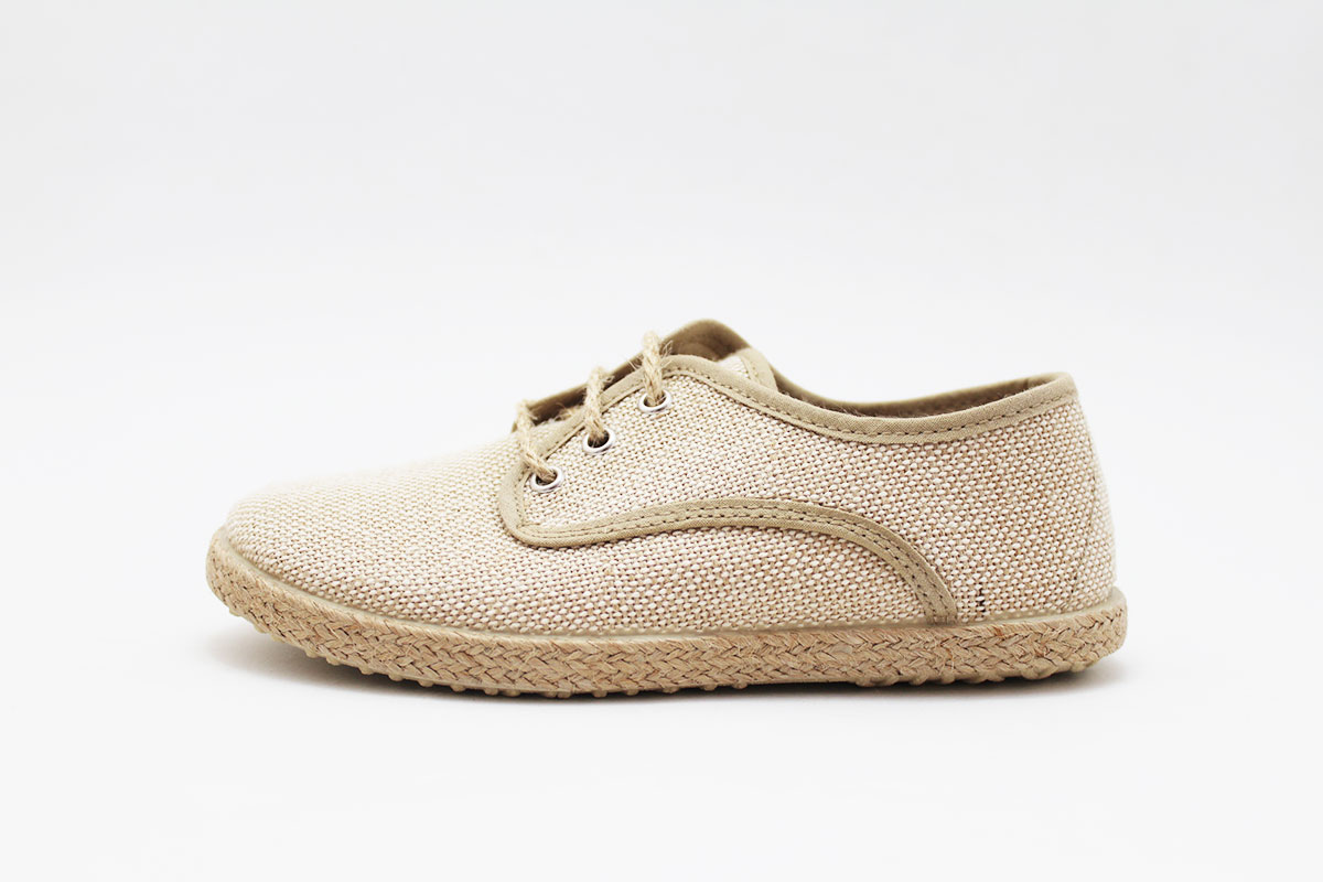 Blucher clásica de esparto en color beige natural, para niño. Fabricado en lona 100% algodón. Un tipo de zapato muy presente en ceremonias.