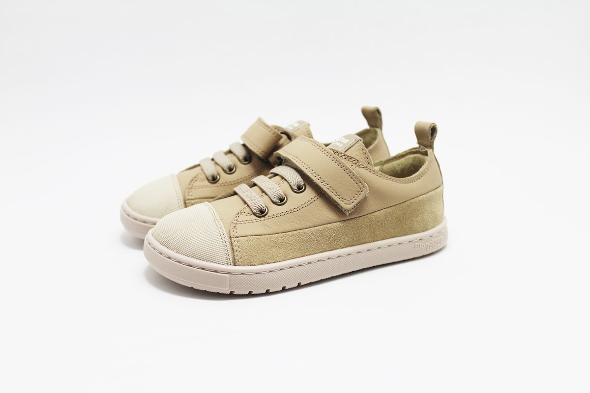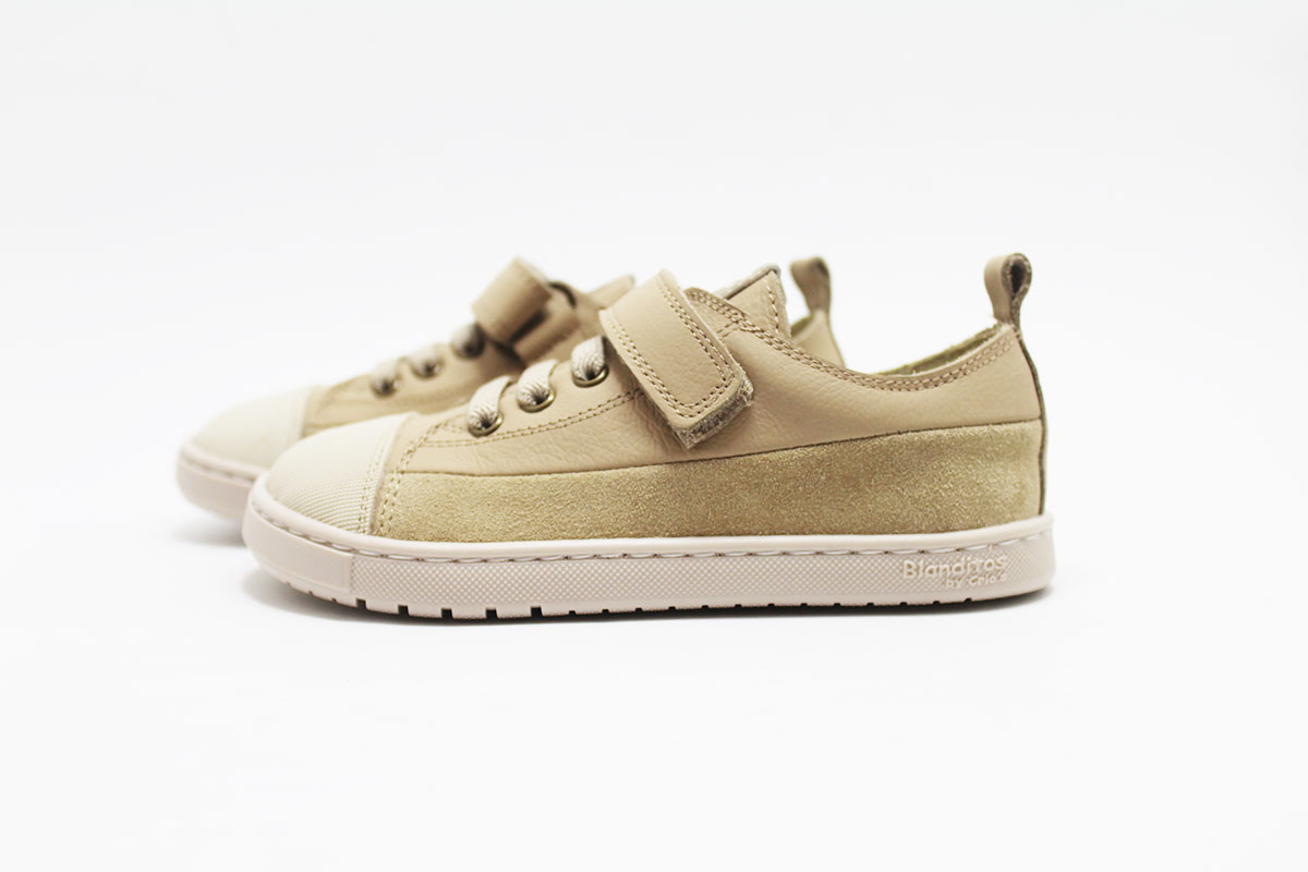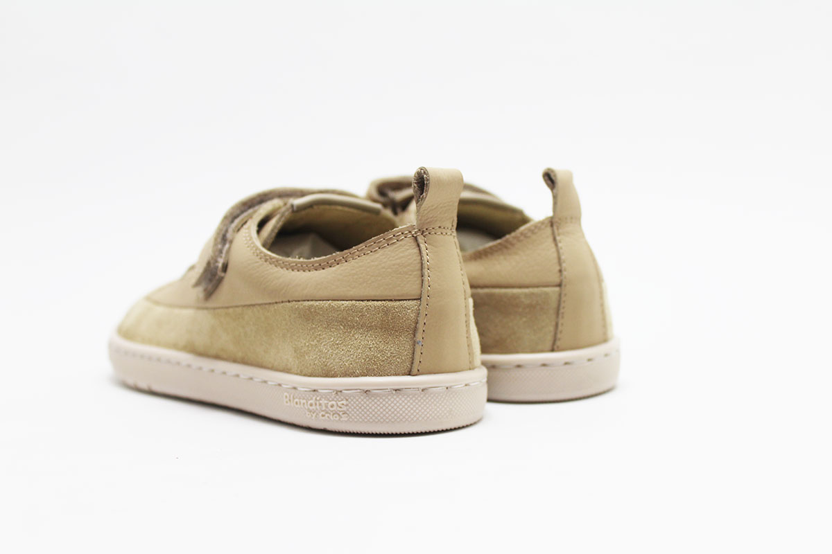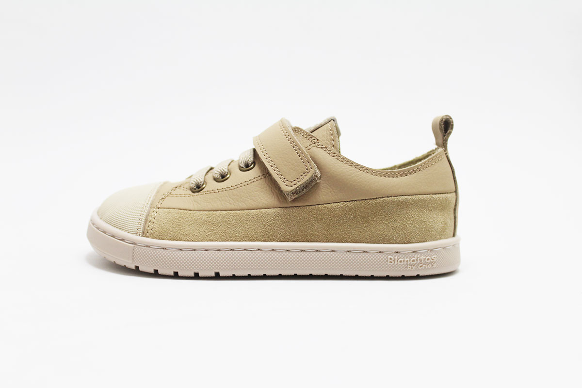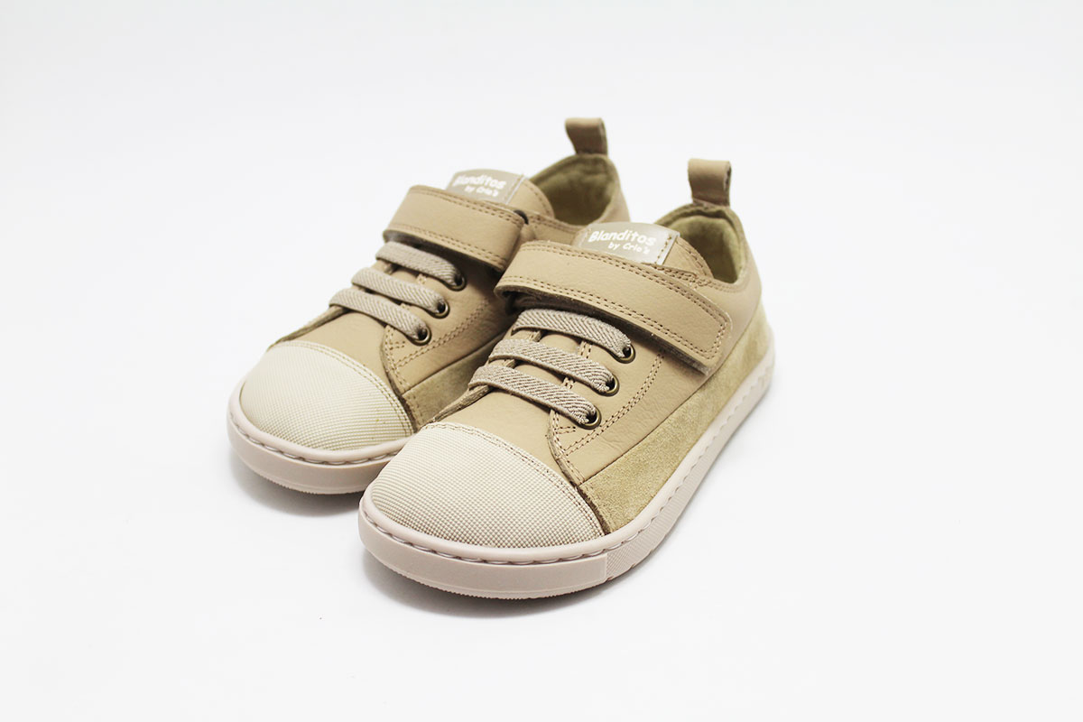 Deportivos combinando beige combinando la suela también al tono, en color beige. Con la suela muy flexible, de la marca Blanditos. Calzado respetuoso, pensando en el cuidado y correcto desarrollo de sus pies.