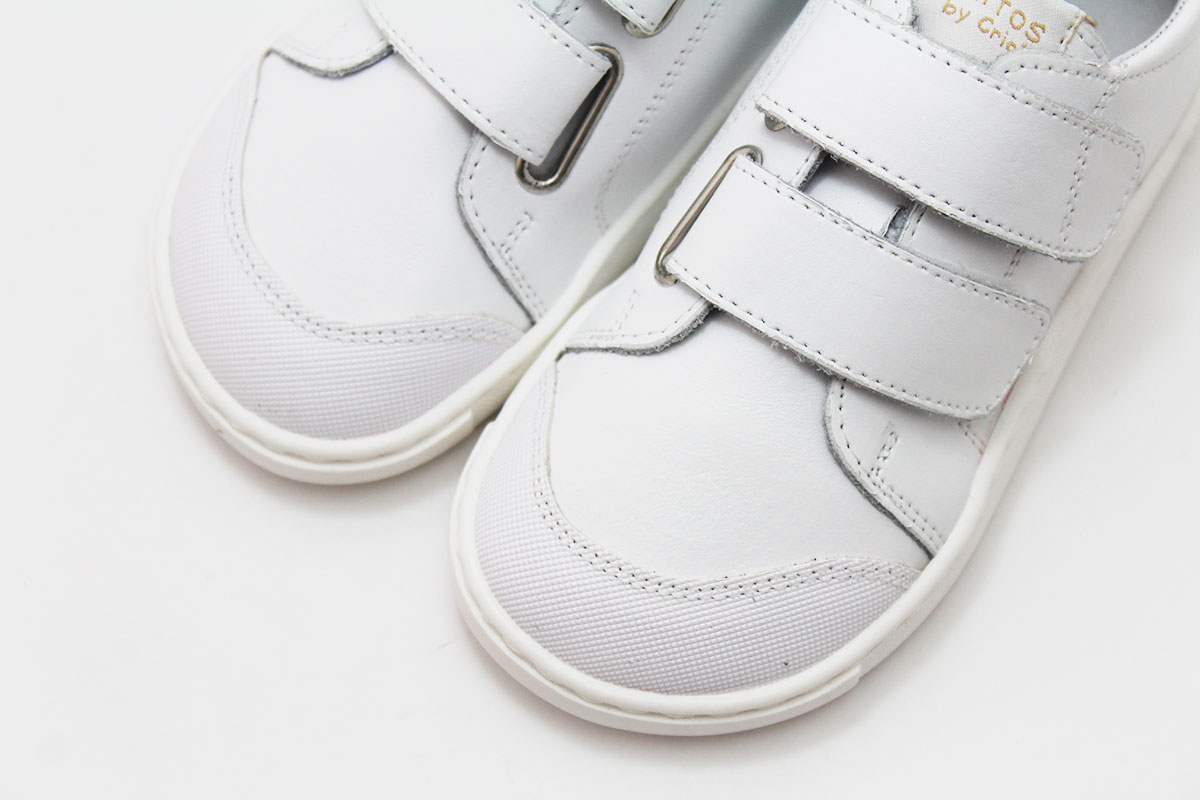 Deportivos modelo RIO blanco para niño con suelas flexibles. Deportivos respetuosos pensados para cuidar los pies no sólo durante su desarrollo si no también posteriormente al mismo. Son unos deportivos de la marca Blanditos by Crios. Disponibles en blanco entero, lo que lo hace un zapato ideal para usar como zapato colegial respetuoso. Un zapato muy práctico para que los usen durante todo el año, al fin y al cabo es un zapato atemporal. Destacamos entre las características de este calzado respetuoso: