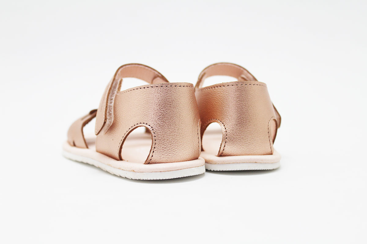 Sandalia rosa salmón con detalle de flor, de la marca Blanditos by Crios, modelo BRISA. Calzado respetuoso, pensando en el cuidado y correcto desarrollo de sus pies.