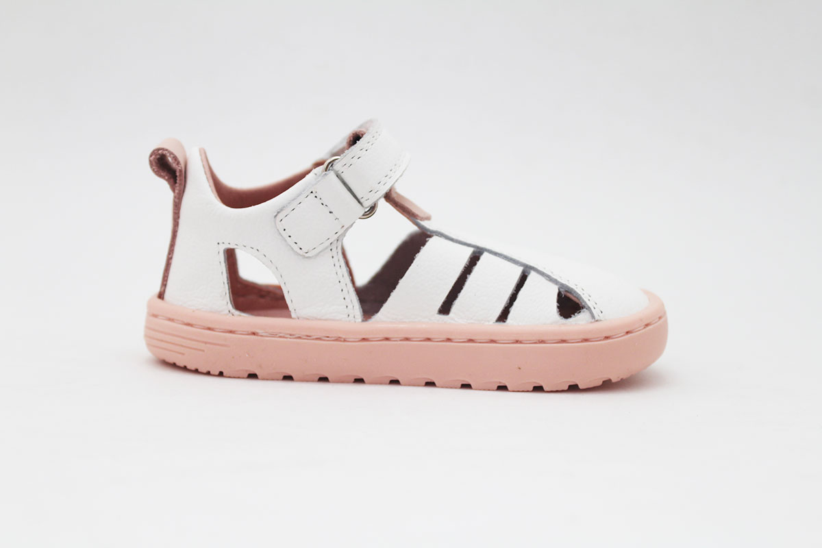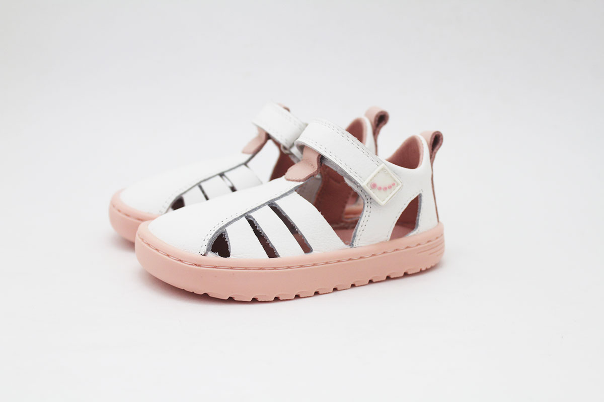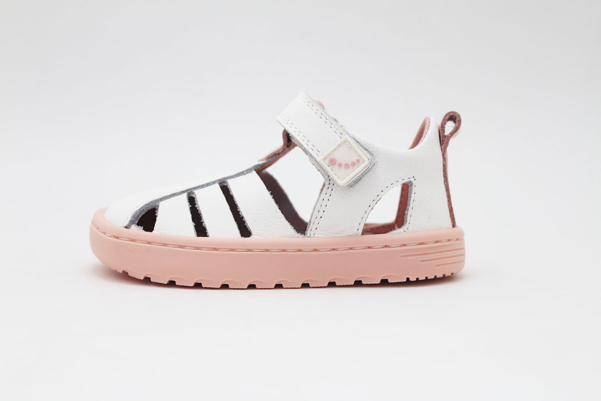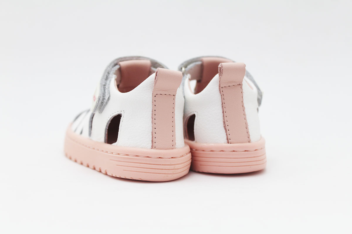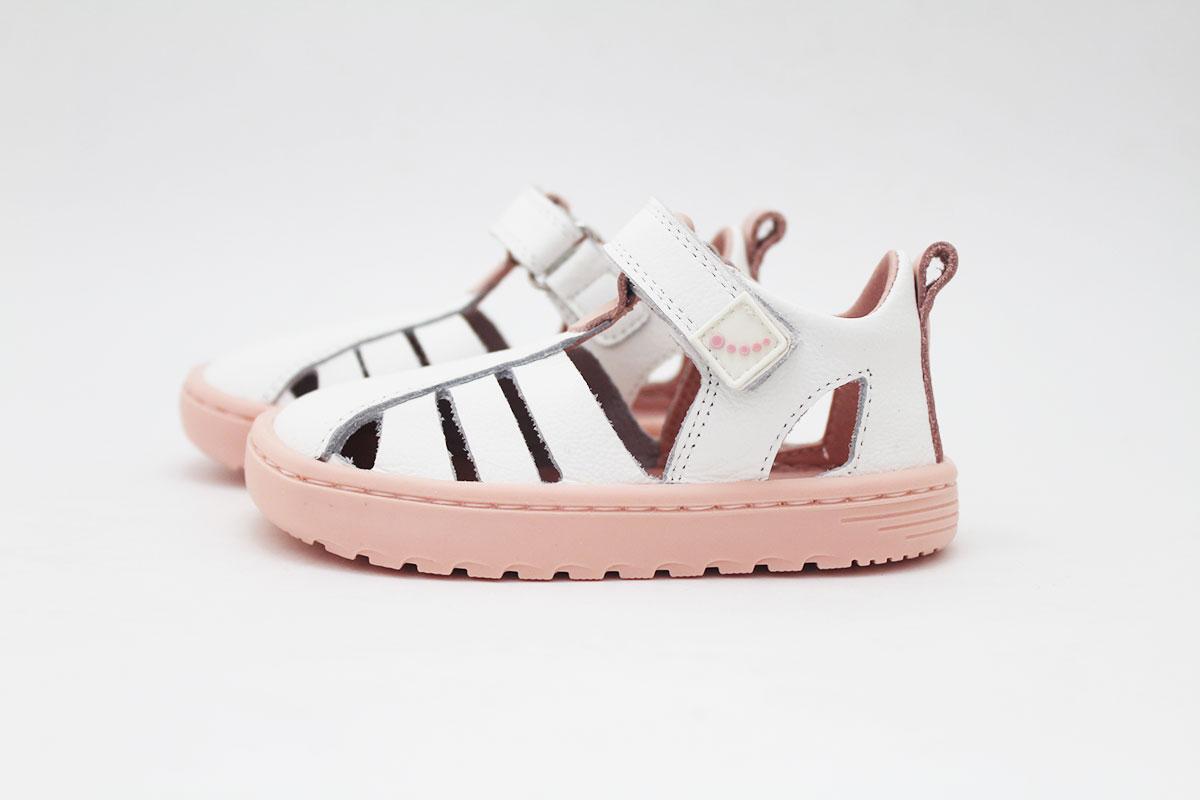 Sandalias de la marca Blanditos by Crios, en color blanco combinado con rosa. Calzado respetuoso, pensando en el cuidado y correcto desarrollo de sus pies.