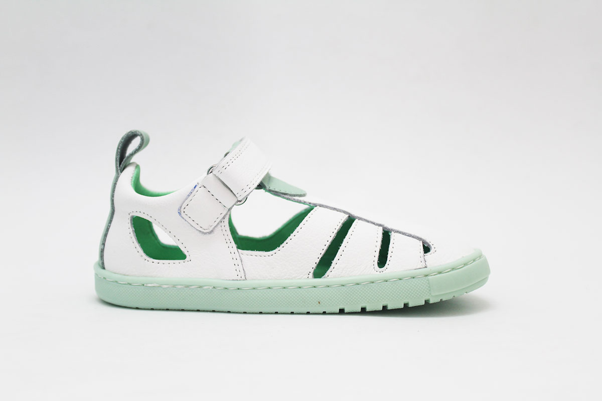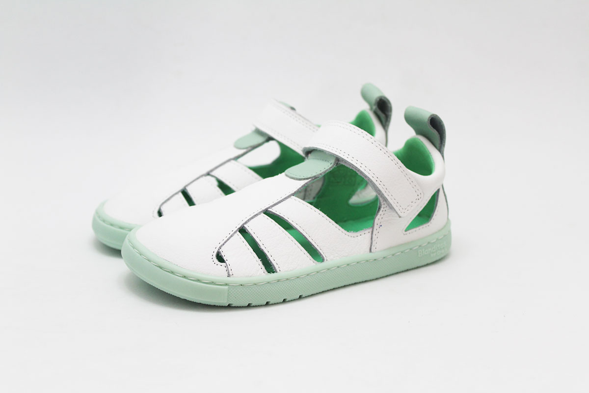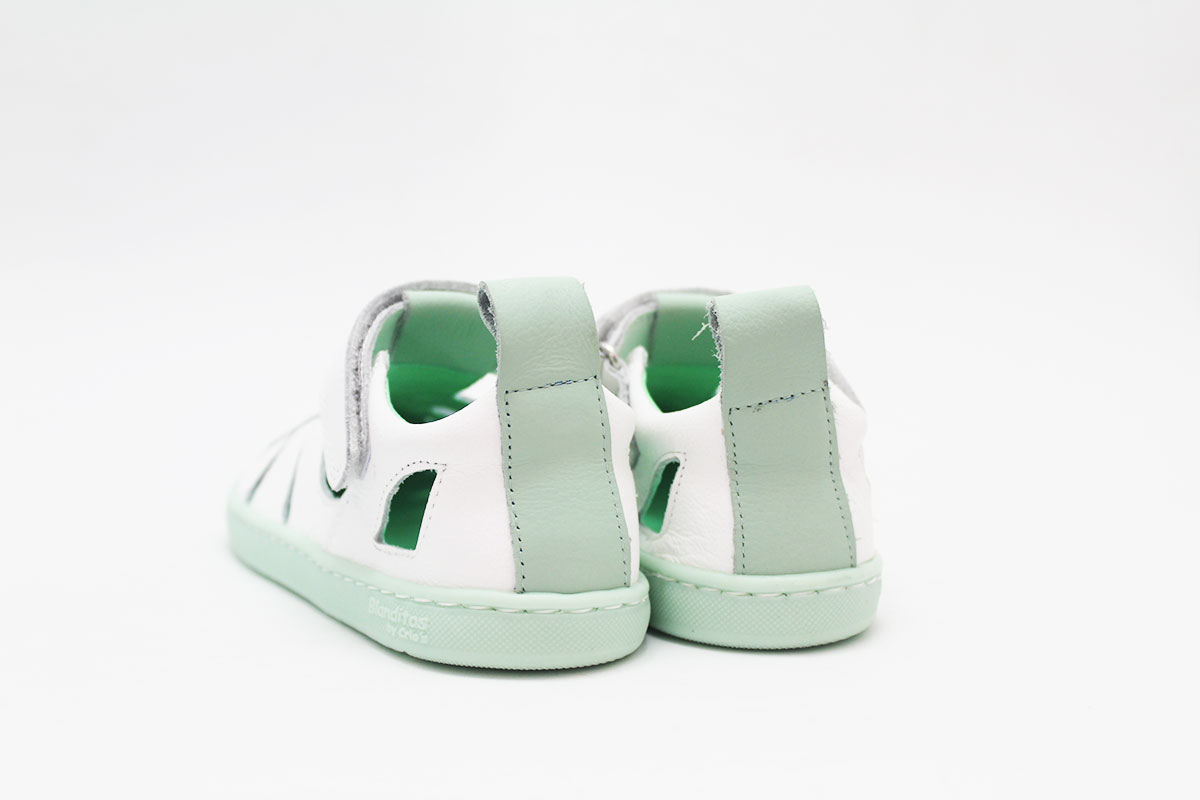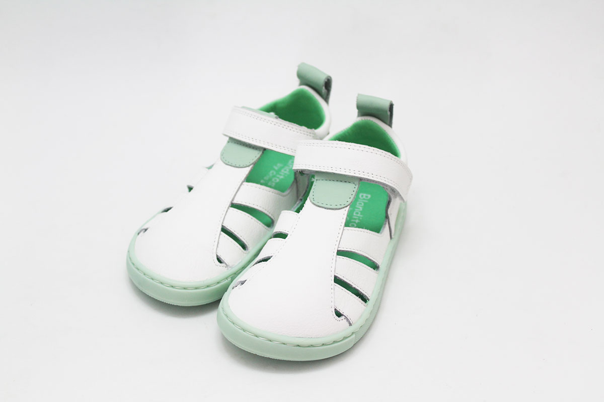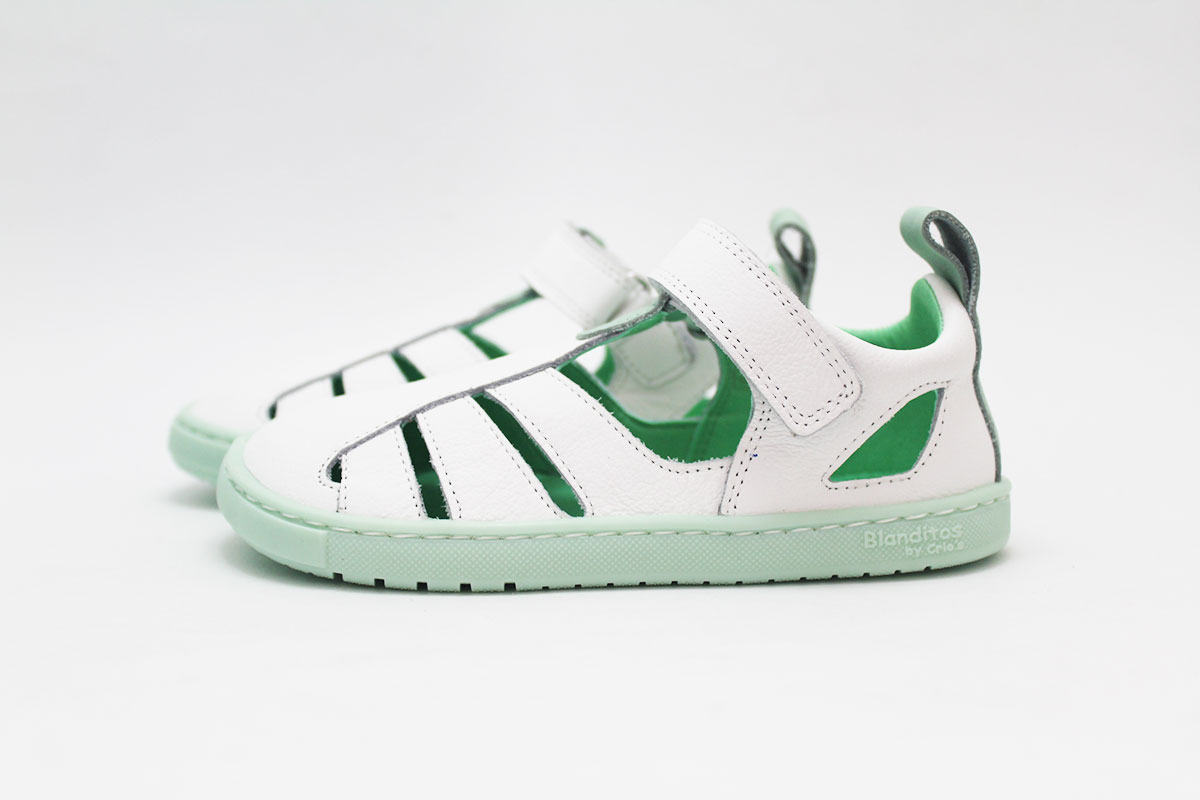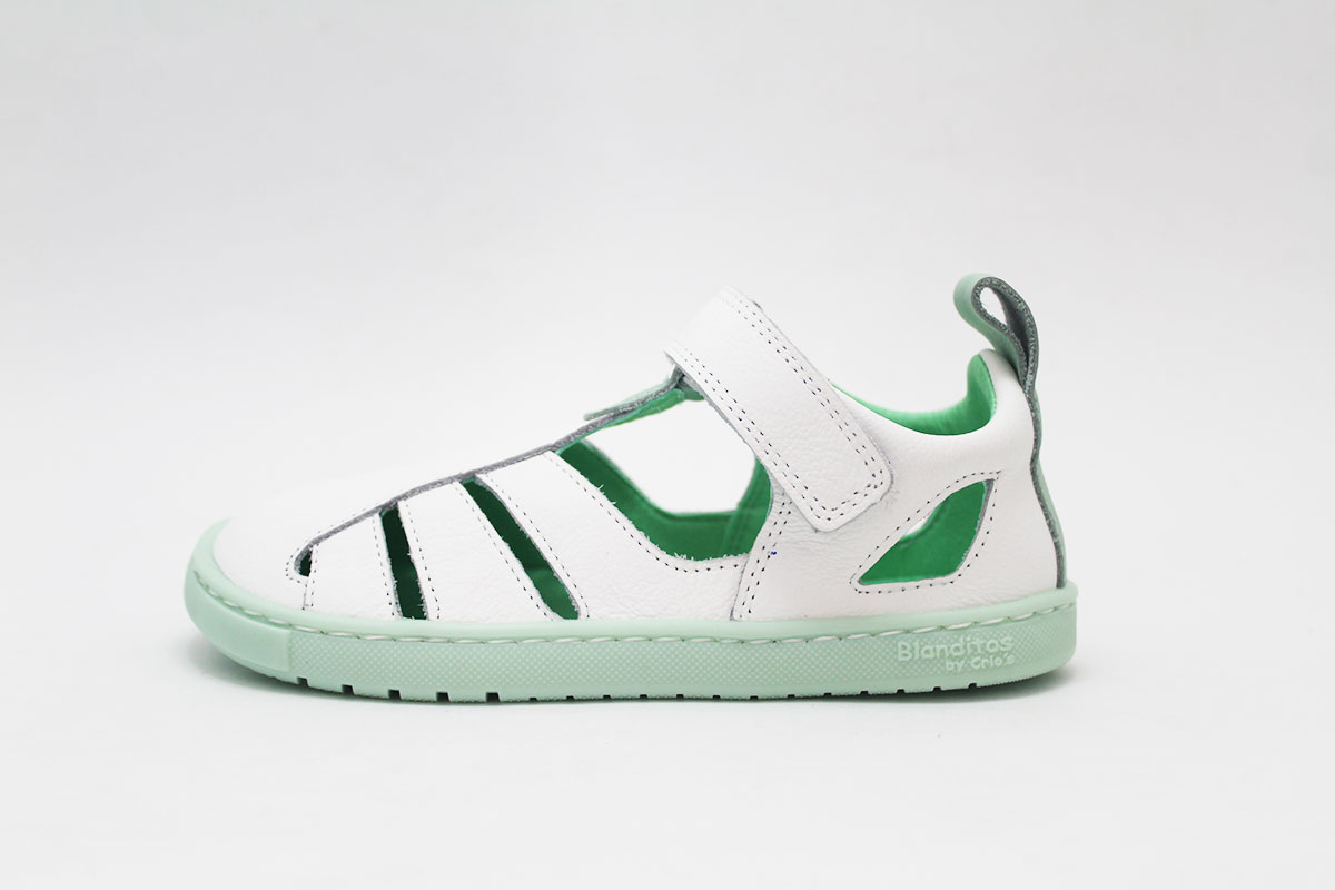 Sandalias de la marca Blanditos by Crios, en color blanco combinado con verde. Calzado respetuoso, pensando en el cuidado y correcto desarrollo de sus pies.