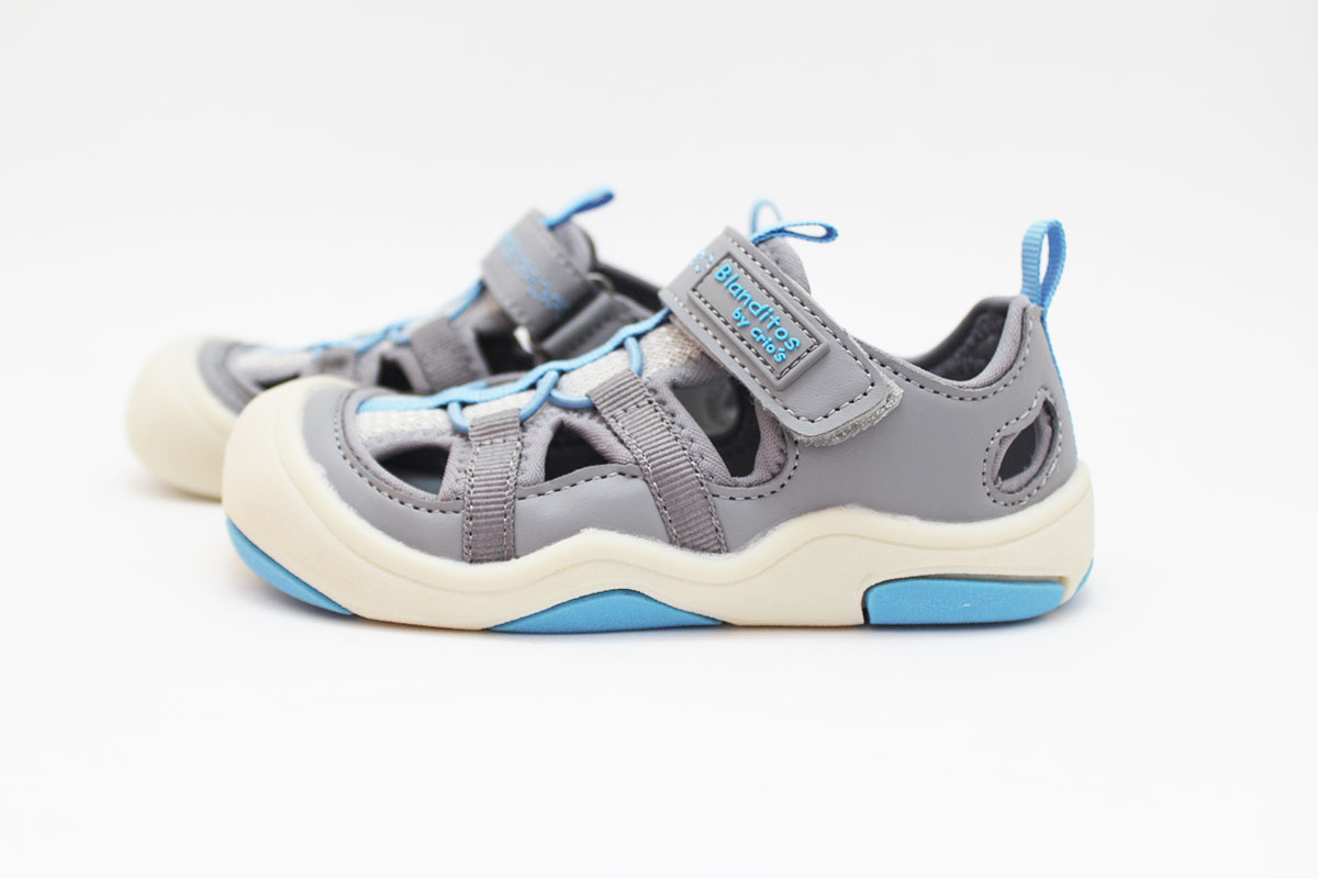 Sandalias tipo deportivas en color gris, de la marca Blanditos by Crios. Ideales para usar en excursiones a la montaña, largos paseos, para campamentos o colonias o simplemente para usarlos como zapato de diario.