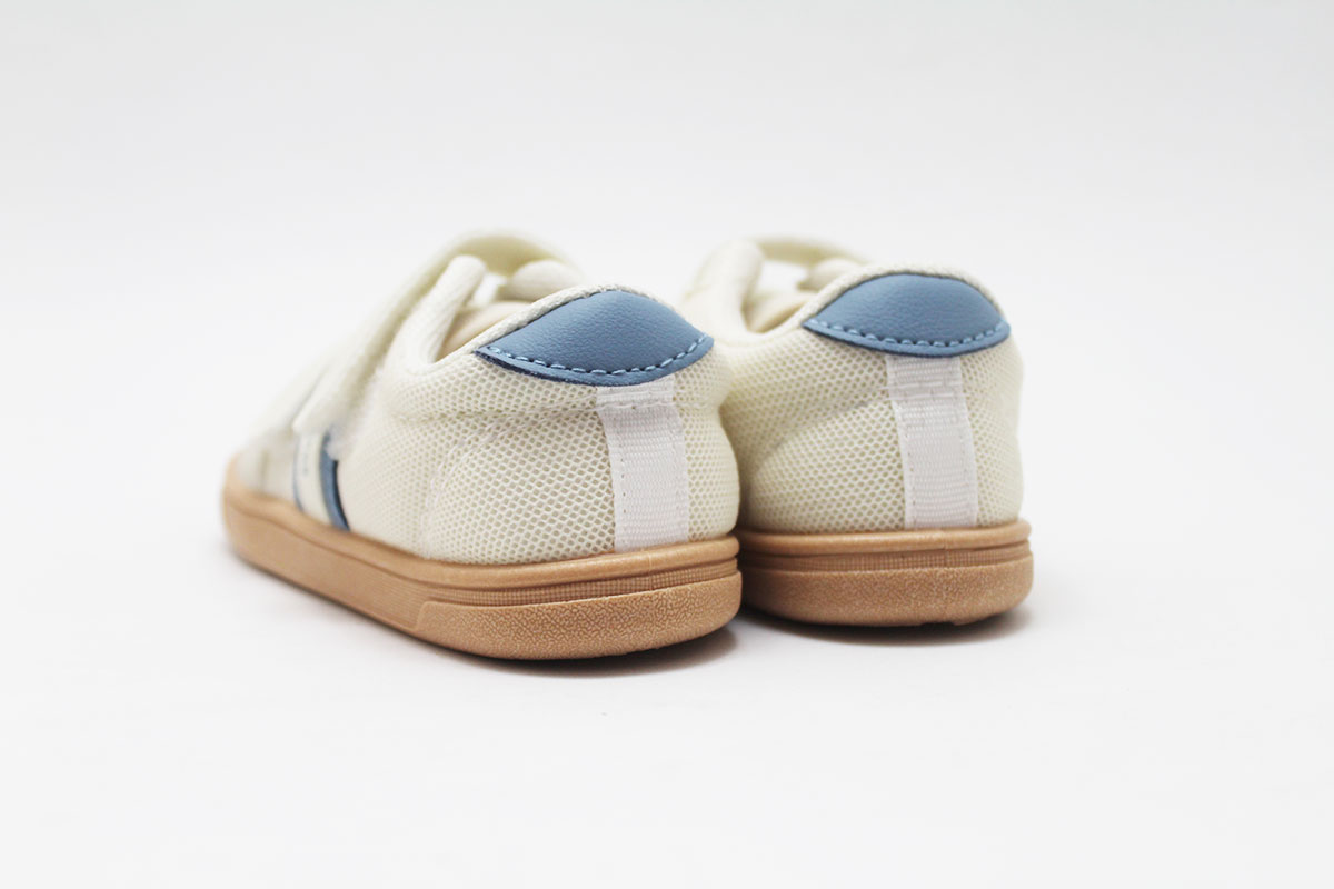 Bambas o zapatilla tipo lona barefoot, en color beige, de la marca Blanditos by Crios, modelo Guppy. Con estas lonas de cierre adherente y con puntera reforzada, las niñas y niños disfrutarán toda la primavera y verano con unos zapatos muy cómodos para el día a día. Tiene un diseño de rayas laterales combinando con tonos azul clarito.